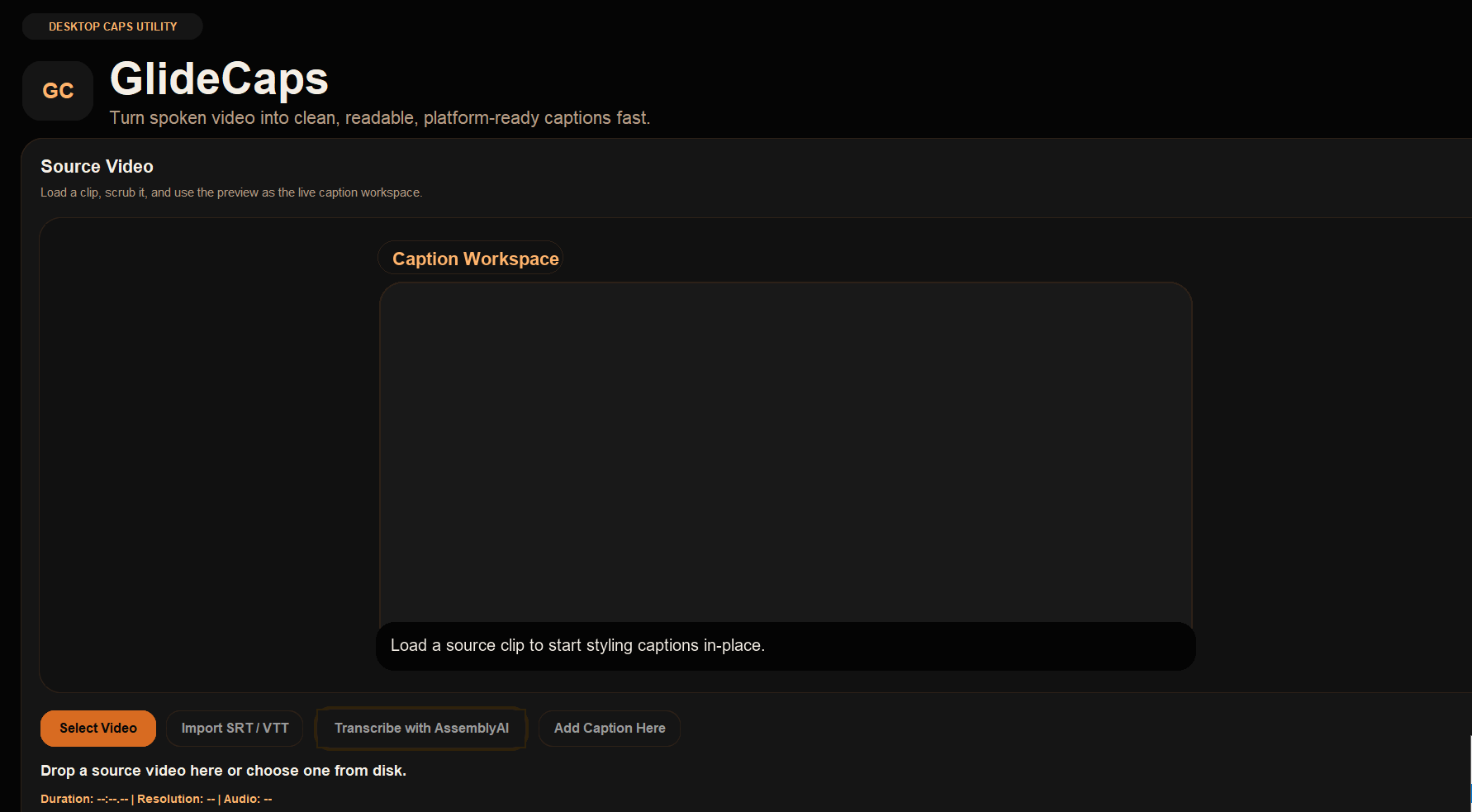GlideCaps is a focused captioning utility, not a full nonlinear editor. It is built to help you get from source video to clean captioned export quickly.